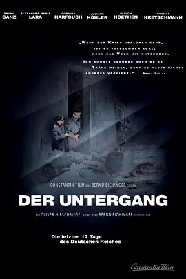 这是一部纪实性电影,逼真地反映了希特勒人生的最后12天,第三帝国最后的日子。苏联红军已经攻入柏林,希特勒(布鲁诺·甘茨 Bruno Ganz 饰)和情妇爱娃(茱莉安·柯勒 Juliane Köhle...